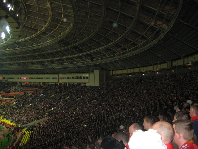 We got the feel right outside our office at the Irish Pub where a group of red fans had already assembled and started their chorus. We took the red line from Park Koultary and proceeded to the Sportinaya station where the stadium is located. That was enough to put us all into the mood. The red line was literally red with the Manchester United fans (The blue fans poured in later) and everywhere it was a sign of jubilation and fun. As we climbed up the long escalator at the Sportinaya station the fans all broke into their chorus waiving their hands to one and all and looking all set for the occasion. As we came out of the station it was the outside of the stadium – our planned final destination. As usual the atmosphere was electrifying. We thought we’ll click as many snaps as possible and move back. As we moved further into the crowd, we realized there were tickets for sale – just like we see in a movie theater when its house full (in those good old pre-multiplex days). 600 Euros was one quote – no chance, 300 Euros next – still no chance and then came the glimmer of hope – an offer of 250 USD. We thought man this is an opportunity. Surely we can afford that. But where will the money come from? We had USD 300 with us and for 3 tickets we needed 300 more. Pradeep turned up at his inspiring best and suggested we ask the ladies back at office. There will still 5-10 mins to go before they head off to the hotel in the cab. And as if it was destiny both Dhanya and Ila had dollars to spare which summed up to 300. We headed back, picked up the dollars and in no time we had 3 champions league final tickets in our hands for USD 600 and in the Manchester United gallery. It took a while for that to sink in. Just a thought passed by – how do we go home at night especially in the highly unsafe stretch from the metro station to the hotel. To hell with it, we thought and headed forward. It was just unbelievable. As we climbed up the steps and had the first view of the ground I was spellbound. Were we really in there? It was still one hour for the kick-off so it was time to grab a hot dog as the fans poured in. With every passing minute it became more and more special. The ‘blue’ gallery slowly filled up right opposite our red gallery and a sea of blue started waiving their checked blue flags and thousand of flash bulbs started flashing every second all over the stadium. We had a small opening ceremony and at 2245 hours the game kicked off. Every seat in our gallery had a red of white plastic which if seen from a distance would spell out BELIEVE in white on a red background. As the teams came out of the tunnel we held up the banner which spelt BELIEVE and it flashed on the screens. The fans were in their chorus non-stop. First it was ‘Country Roads Take me home’ and then ‘Viva Ronaldo’, waiving their red and white scarfs all through.