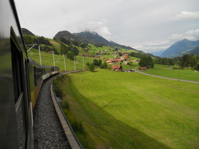 We woke up and started early. Our plan was to go to Interlaken and then take the Golden pass train to Montreux. Interlaken was one place where we had been before but could not see it properly as we had less time and then got off at the wrong place. This time we had some idea and hence thought of making the most of it. We took the train from Fribourg to Berne and then the train to Interlaken. The train journey from Berne to Interlaken is a wonderful experience and we had immensely enjoyed it on our previous visit. The Thunersee Lake provides a beautiful spectacle as the train moves forward in breathtaking speed through the beautiful scenery. We got down at Interlaken Ost (unlike the previous occasion where we got down at Interlaken West) and took the bus to a place called Bonigen which provided a beautiful view of the lake. Bonigen was as expected a beautiful place. It was quite, serene and not at all flocked by tourists. I was surprised as to how such a spot in Interlaken could be left out by tourists. Anyways it was good for us. We could see the beautiful wooden houses, the greenery and most importantly the turquoise Breinzersee Lake. The weather was cloudy; there was a cool breeze blowing and the lake sported multiple shades of blue in layers. The photographs made for a typical Swiss picture postcard. We then decided to take the same bus to its last stop Iseltwald. This would be similar to Bonigen but further away. Iseltwald was as beautiful and so was the drive towards it on the bus. We were hungry by this time so we had a quick fish-n-chips meal at Iseltwald which we could not finish and packed it for our Golden Pass ride. We had to take the bus back to Interlaken Ost so we hurriedly packed off our food and boarded the bus.