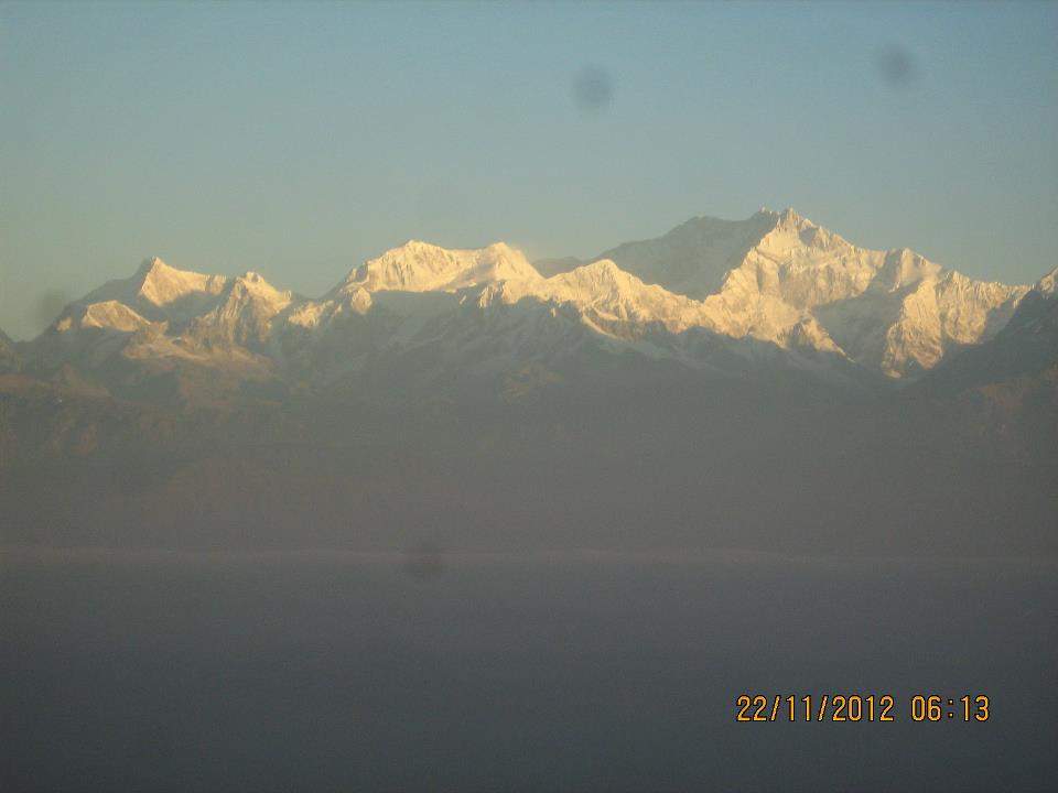 From behind the hillocks deep down the valley up came the orange ball at about 6 AM drawing huge cheers from the waiting crowd. We rushed out of the comfort of the shade to the open balcony to get better opportunity to capture clear picture. Joy made a blind attempt by raising his camera well above his head. It worked. When we were appreciating the catch on the camera screen another natural beauty was unfolding on the other side. From nowhere in the darkness of the northwest sky rose our all too familiar Kanchenjungha – draped in orange light. All for a few minutes only. Then it became snow white all over again.