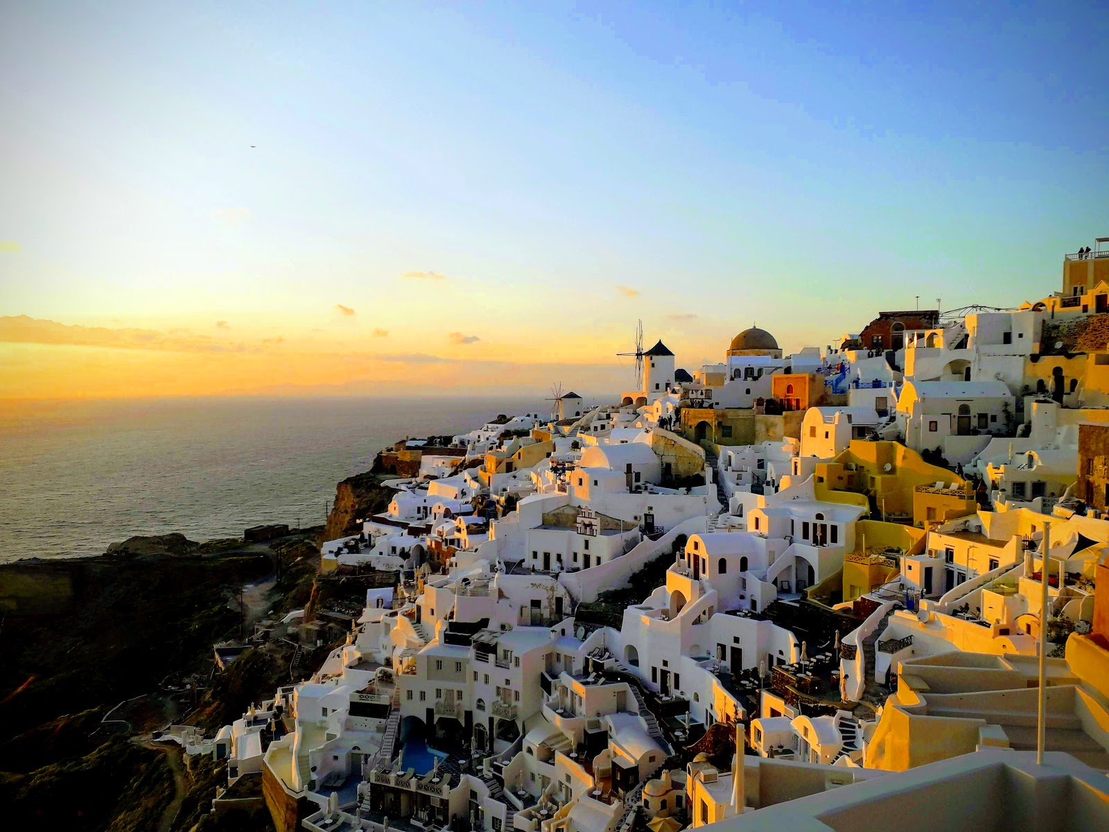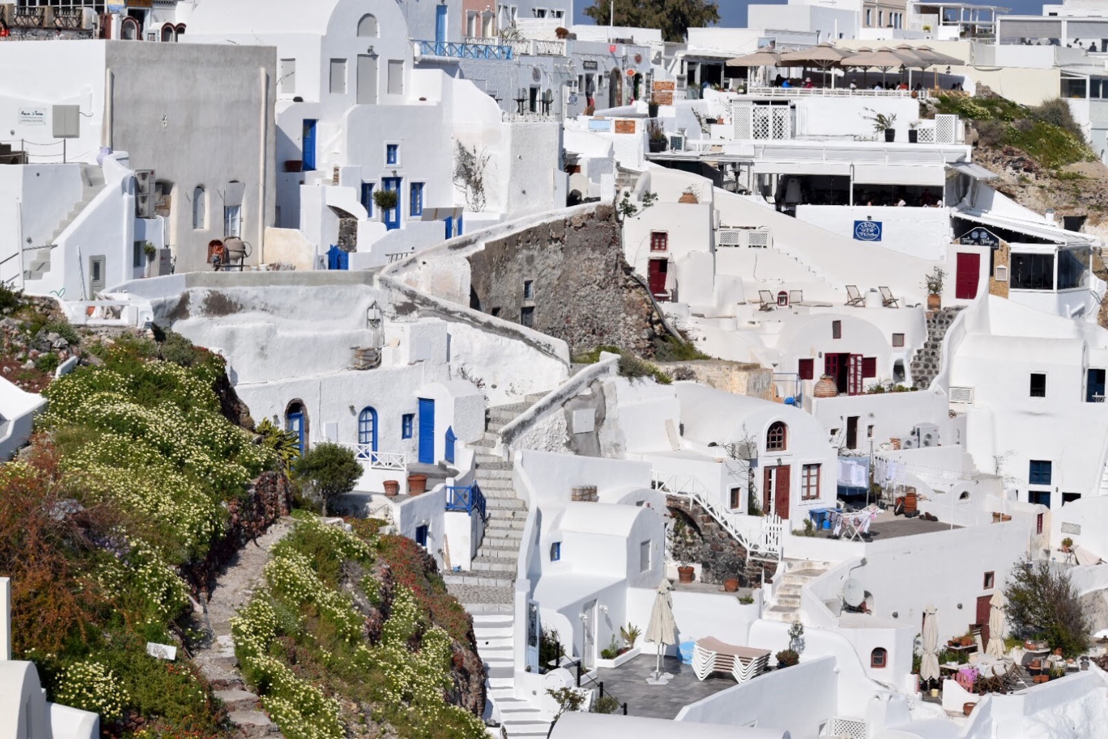 The weather update was encouraging. While it was cold and windy, the rains stayed away and it would only get better. We walked ourselves through the ‘white’ lanes of Fira. The island, as is well known, is completely ‘whitewash’ed. Rather every single building is whitewashed which makes for many a beautiful picture. The season was yet to start, and one could see many a labourer frantically completing their whitewash as the tourist season was officially slated to start the next day on the 1st of April. We found ourselves a restaurant overlooking the sea and had another amazing Greek meal. The place was not fully buzzing yet. It could be a combination of the weather and it being a Sunday as well as the fact that it was not yet the season. Nevertheless, it was enough for us to check out souvenir shops whatever was available. We were told that from the next day all would be business as usual. After hanging out in Fira town for a while we decided to move on to the more touristy village of Oia. This was the main village of Santorini most famous for its gorgeous sunset. The sunset would be the same everywhere, just that the one viewed from Oia was the ‘branded’ one and marked as a special tourist attraction.
