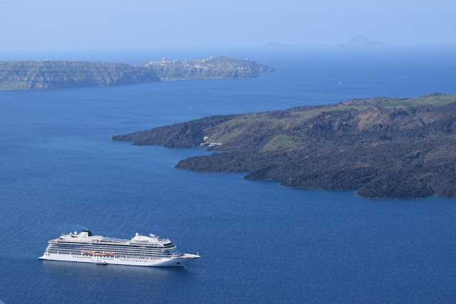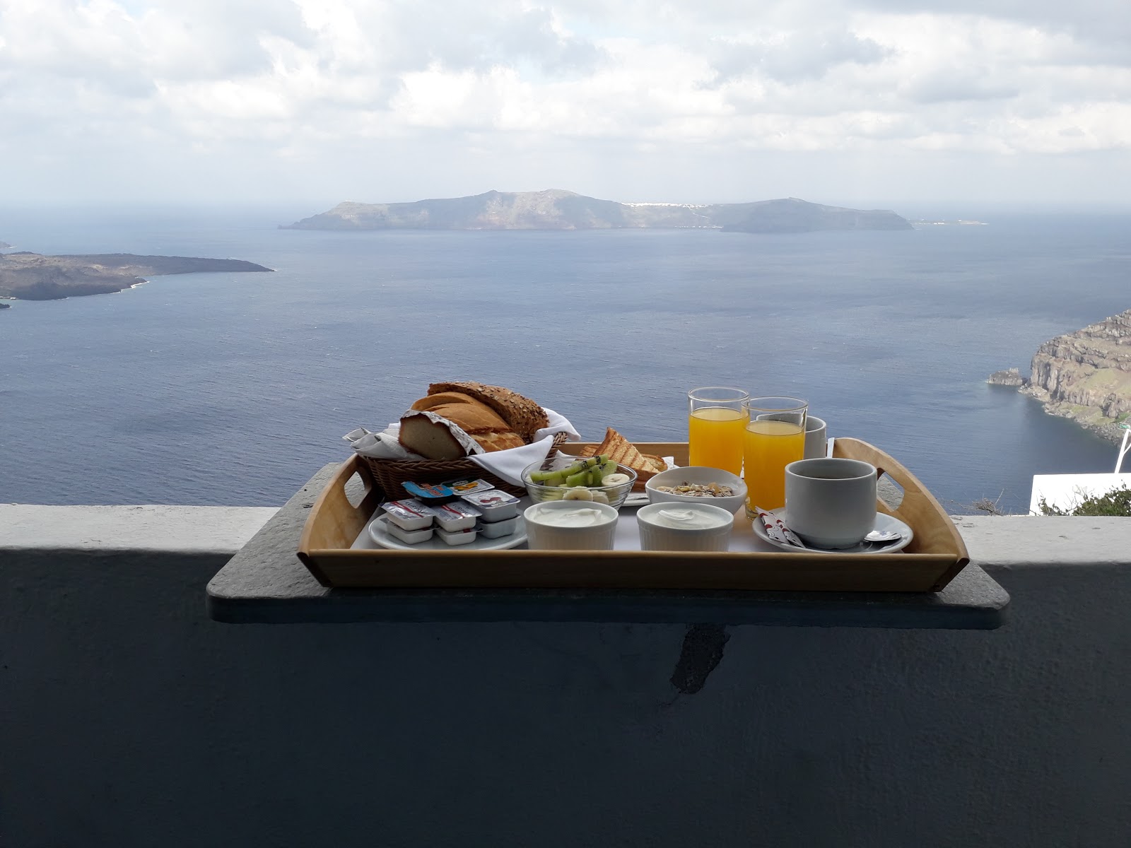 The weather at Santonini was not that great and we knew it. It was not ideal for an island of which you had only seen sun-kissed photos and hence anything else would be a dampener. Thankfully, it was not raining. The rains had just subsided a couple of days back. The sun was still playing hide and seek but the biggest deterrent was the cold wind. Not something which one would like on an island. There was hope though. We would be here for three days and each day it would be getting better. We were booked at the town of Fira and our taxi duly took us there though the driver pulled off a trick and did not drop us till the door when it could have. He told us that we need to walk the last stretch as the path was not a drivable one. Well, there was certainly one. We had to bear the cold winds for a while as we guessed which way would be the entrance to our Hotel Kaiferis. Finally, after a longish walk up the slope we reached and found some respite from the cold. All the troubles were forgotten as we checked in to the room and got the most gorgeous view of the Aegean Sea. Due to the cloud cover, the blue colour still was not quite there but such was the beauty it hardly mattered. We had our breakfast in the room in the small balcony with the gorgeous sea as the backdrop. A photo which my wife so longed for. It was still quite early, so we rested in the room and caught up on some sleep after which we set off towards Fira town center at around lunch time.