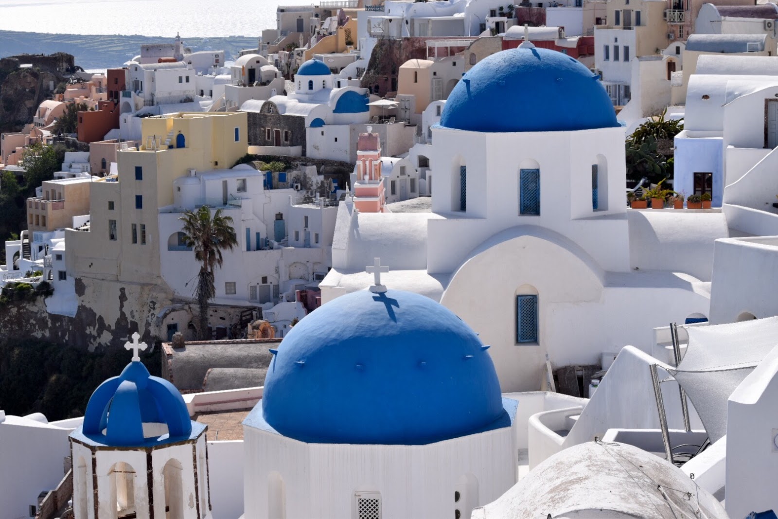 As expected, the weather went one step ahead to being the perfect one for Santorini. The sun was shining with just a nip in the air, pleasant enough. Just outside our hotel was one of the most iconic photo points of the island – the blue dome with the three bells, overlooking the volcanic island not very far away. There are boat trips that take you to the island but since the season had not started in full steam, the boats were few and very time bound. So, if one missed the one at 10-30 AM, the next would be at 2 PM. We were in no mood to be dictated by public transport timings so we dropped the idea of vising the island or the beaches that were around. We thought that with the time in hand it was better to walk around and explore the lanes rather than using up a whole day travelling. We followed the trail along the cliffs away from our hotel towards the village of Imerovigli. It took us around twenty five minutes to walk through the lanes and reach a quiet village. The lanes were lined up with restaurants, mostly filled with just enough people. The cliffs were lined up with whitewashed houses which were mostly hotels and shops. We found our way to the main road where we located a restaurant to have our lunch. Another sumptuous Greek meal followed after which we planned to go to Oia to watch another round of the ‘famous’ sunset, this time in clearer conditions. The roads wore a deserted look as we walked to the bus stop and waited for the bus from Fira. An elderly couple was waiting there as well and they updated us that they had arrived a few days earlier and found the worst possible weather with storms. We just realized how we ‘weathered’ the storm and escaped with minimal damage to our plans. Oia looked more beautiful with the sun beating down and the skies blue. We made our customary walk, then took a snack and ice-cream break at a restaurant and then walked all the way past the sunset point through the lovely lanes and steps on the cliff reaching a windmill. I cannot say if it was functional or just there as a heritage value to add to the scenery of the place. We got the gorgeous sunset view of the place. The sunset was normal just like anywhere else and I am sure it would be the same from our hotel room but the sight of the crimson hue falling on the buildings was indeed a sight to behold and one for the postcards. It remained the cover picture of our Facebook page for the next six months. After a round of coffee, we were on our way back to Fira by the last bus. We settled for dinner at Fira at the same Italian place and retired into our hotel.